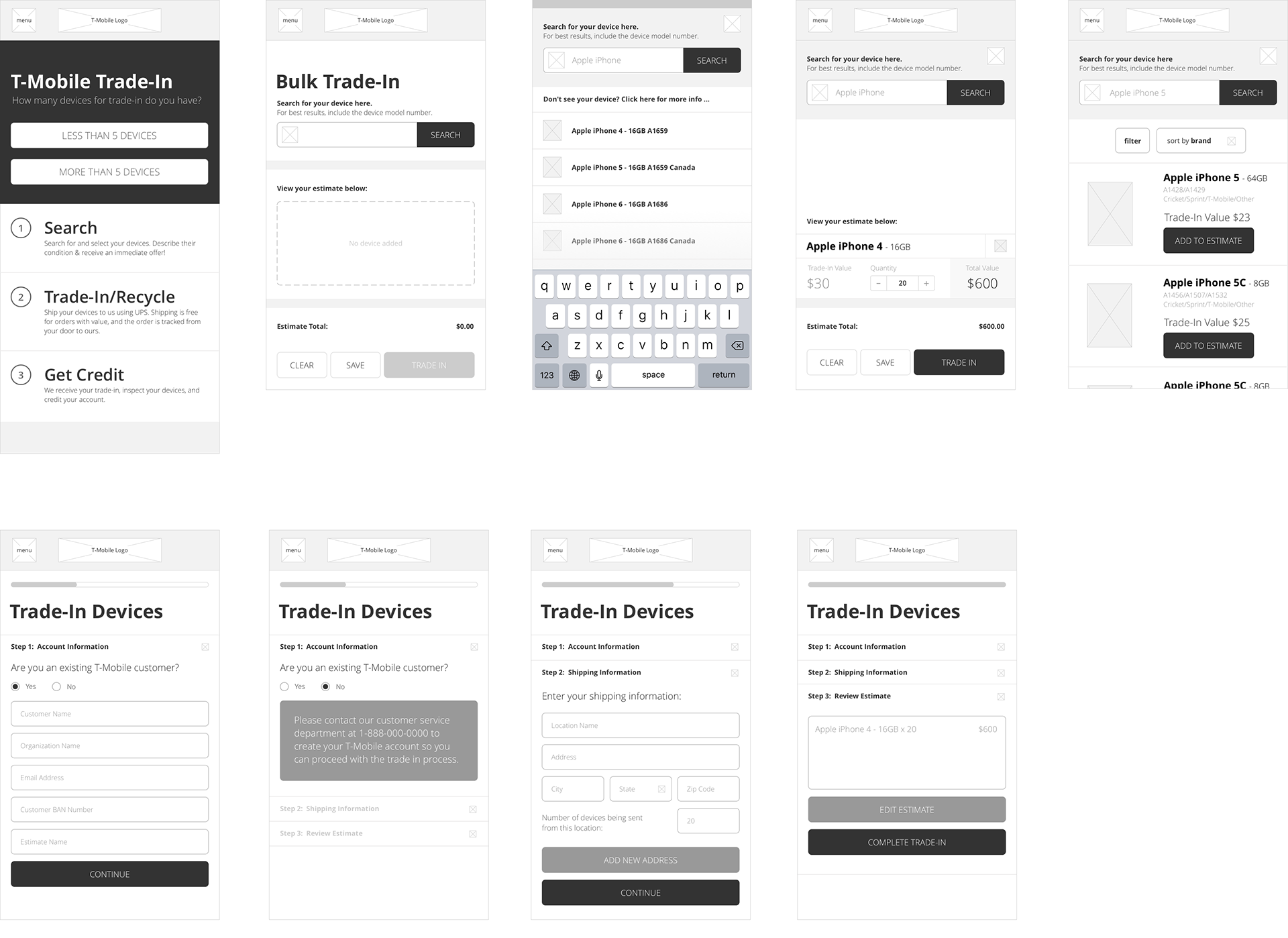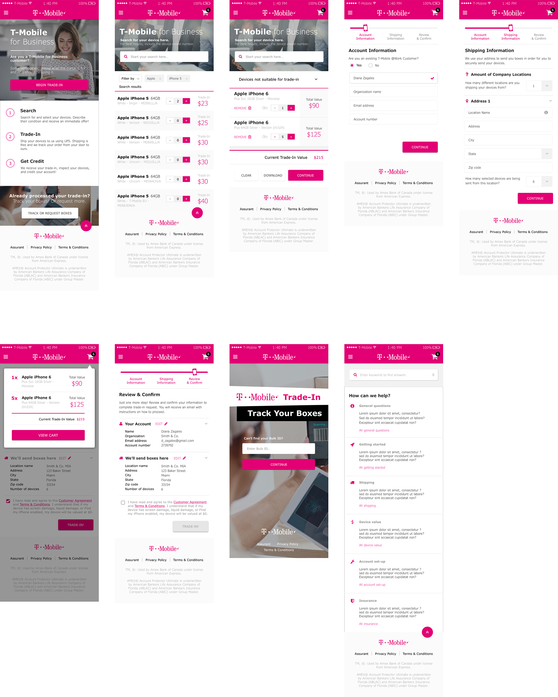 Based on the information discovered, we resolved to create a self-service customer portal with an automated workflow that provided the customer with a quick and consistent trade-in. Our goals were to streamline workflow for T-Mobile employees & improve the user's overall trade-in experience.