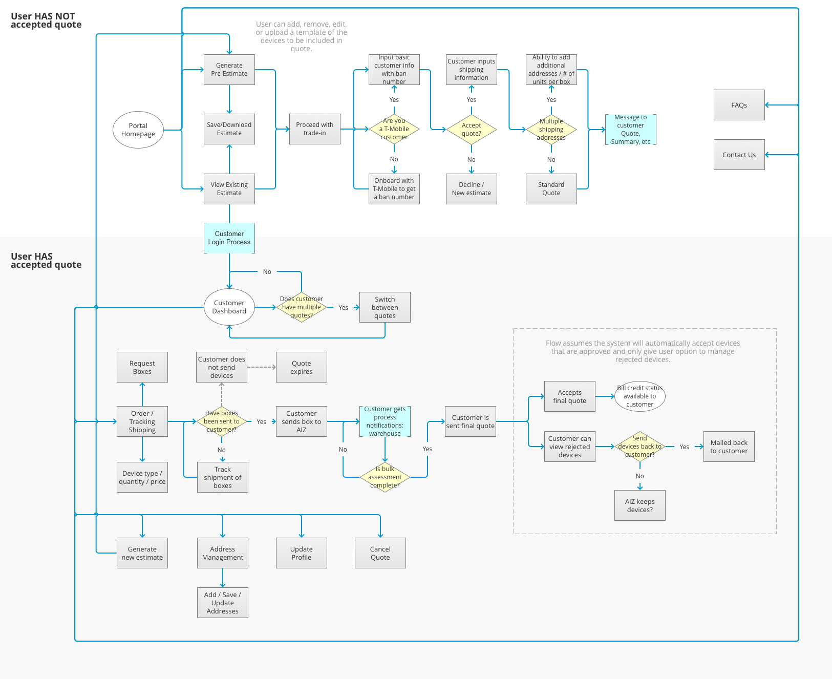 After listening in on customer service phone calls, we concluded that customers lacked clarity on the existing process and were frustrated with the length of time to receive upgraded devices. The existing process required T-Mobile customer service employees to provide an initial trade-in price quote, validate the T-Mobile account, process the estimate details and handle shipping out new devices all via email communication with the customer.